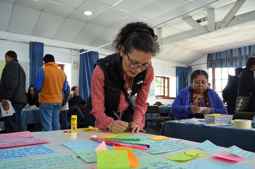 La mañana avanzó entre conversaciones que fluían de una mesa a otra, donde se entrelazaban las voces de representantes de organizaciones de base, sociedad civil, pueblos indígenas y academia. A partir de los aprendizajes recogidos en el documento de “Síntesis Regional de experiencias sobre transformación de sistemas alimentarios – Co-crear, Participar y Sostener”, elaborado por FFLA, las y los participantes compartieron experiencias y reflexiones que dieron lugar a preguntas que abrían el pensamiento colectivo: ¿cómo integrar distintos tipos de conocimiento?, ¿cómo fortalecer la participación comunitaria y el rol de mujeres y jóvenes?, ¿cómo incorporar tecnologías desde los territorios y articular esfuerzos que ya existen?